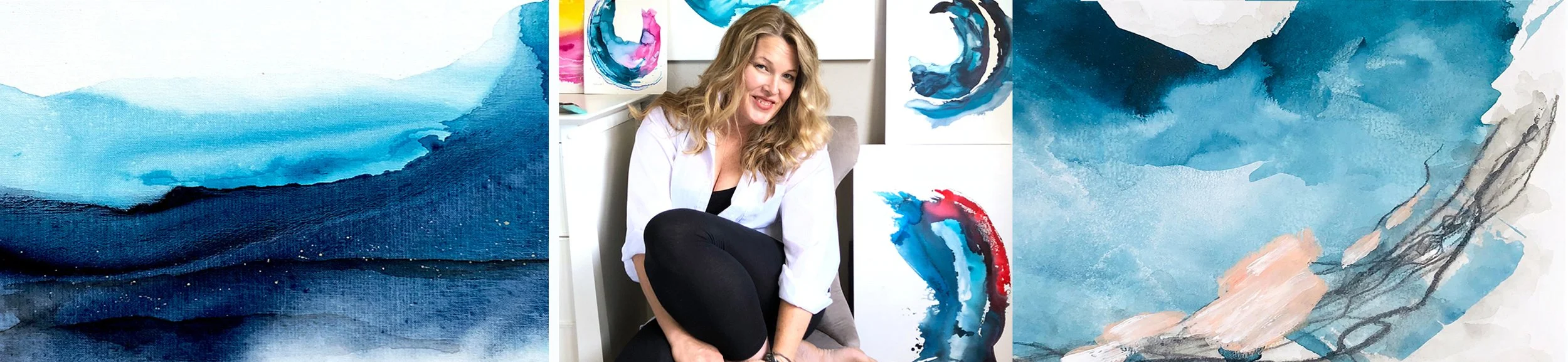 We need more creativity and more art- real, free, messy, colorful, joyful art. So I work towards that goal from my studio in Santa Cruz, California, taking inspiration from nature and am heavily influenced by the ocean & moving water. I have my AA in Art & Humanities and my Bachelor’s in Interior Design and I’ve been painting and showing my art for well over a decade. I’m a member of the Visual Arts Network through the Arts Council Santa Cruz & I love participating in art shows, galleries, arranging personal studio visits and opening my studio to the public at Open Studios every year. Thank you for joining me here!